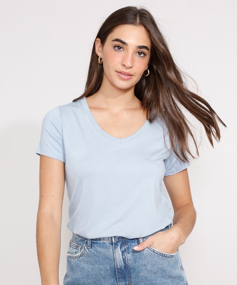 Camiseta Feminina Básica Manga Curta Decote V Azul Claro